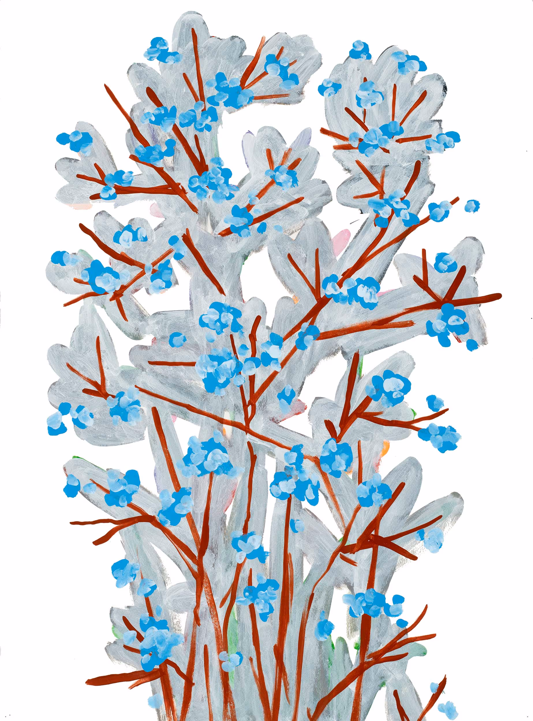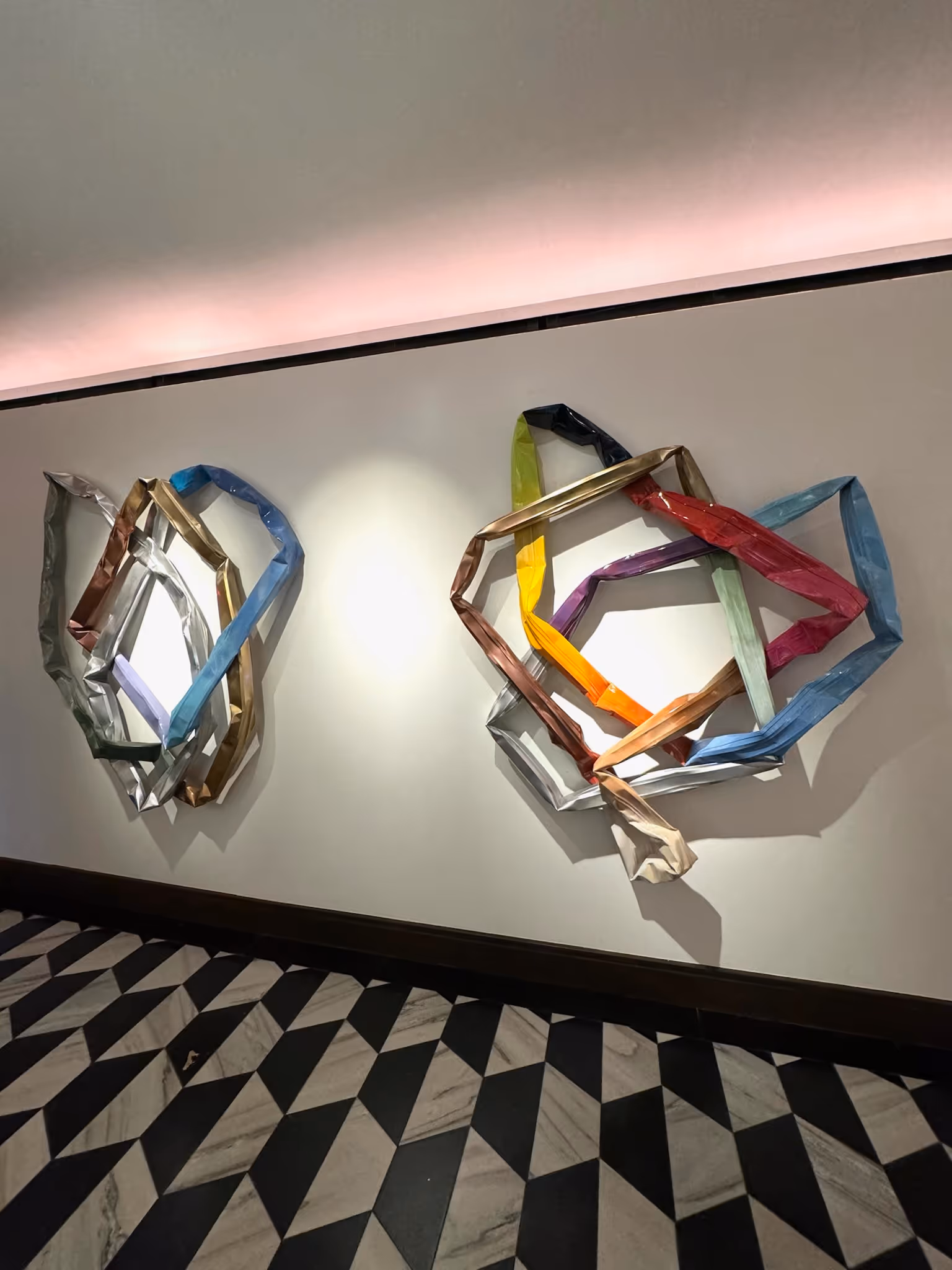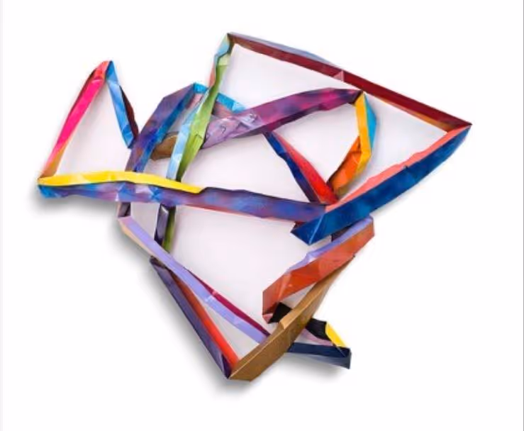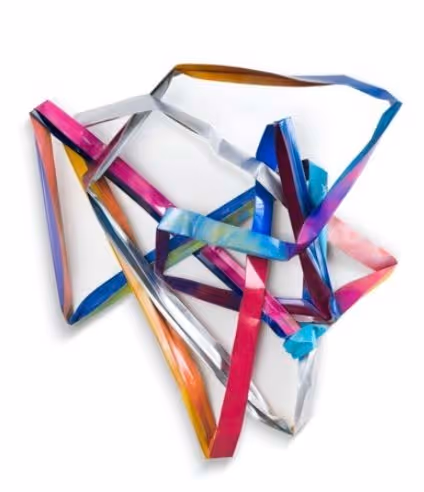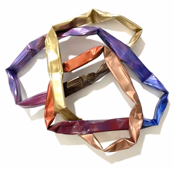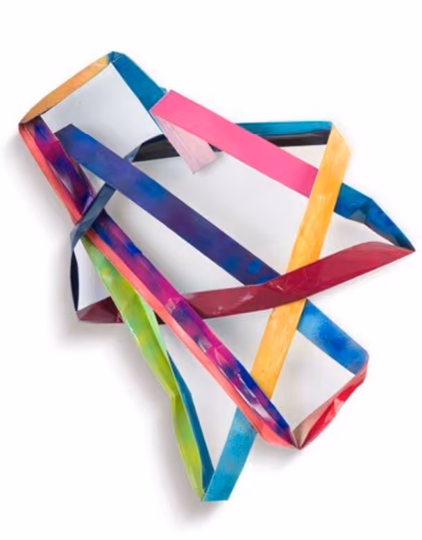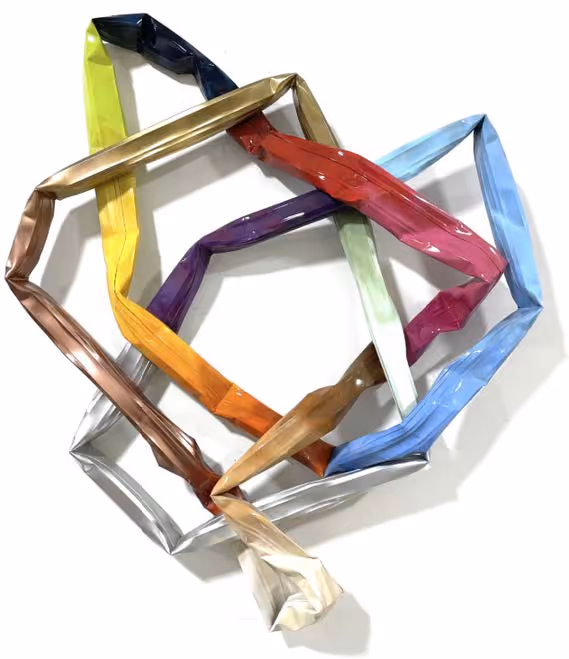 Through the wreckage, Hoitsma discovered scraps of aluminum gutters, which he then brought back to his studio. Hoitsma bent and colored the pieces to resemble abstract hearts. “I started shaping and repainting them in incredibly joyful shades, inspired by the resiliency of the human spirit,” he recalls. Though metal wall sculptures may seem like a departure from his large abstract paintings, they reflect a return to themes of hope and renewal central to his artistic vision.