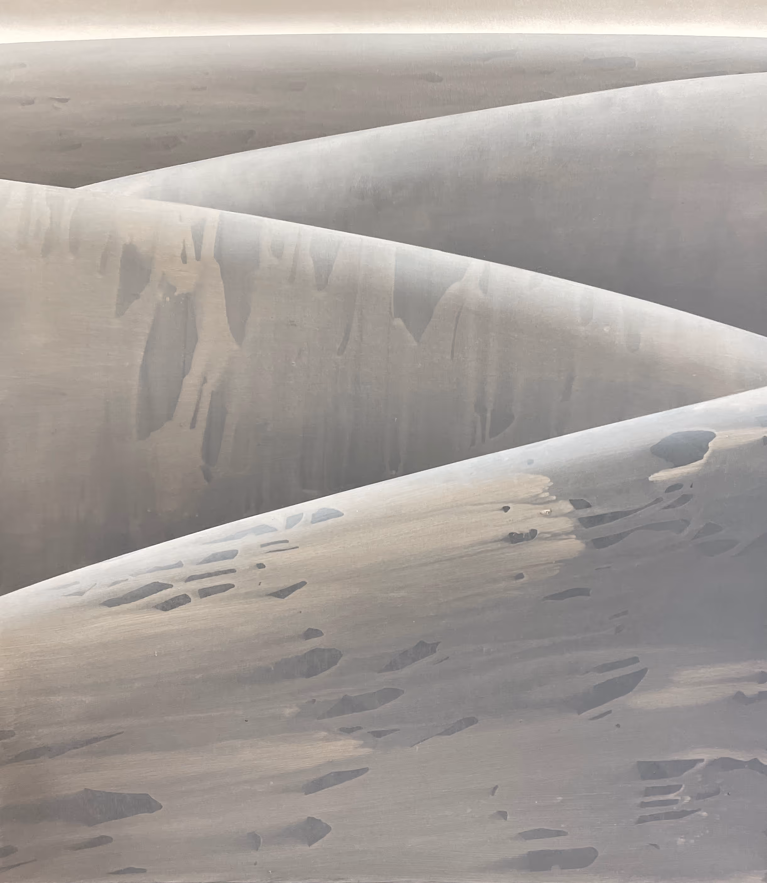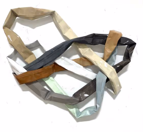 In a new series of work, Is This The True Story (2024), Nazzal moves from the sky as her canvas to a monochrome page in which she invites the viewer in. In three gestural forms akin to crumpled paper, she subtly distorts her streaming lines, removing elements of her former work in order to begin anew. Color is subdued and gradient disappears. A steely pastel blue is interrupted by the shock of a bright orange on the backside. By not revealing the full image as flat, Nazzal marks an in-between state, starting and stopping to witness and question reality as one might in a lucid dream.