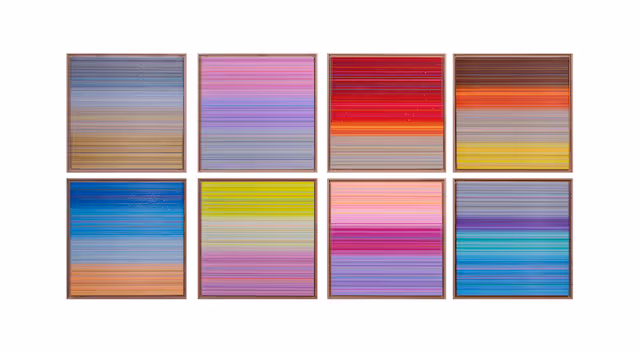 Stefania Nazzal (b. 1976) is a Swiss artist who currently lives and works in Dubai. Nazzal trained at the Cyprus Academy of Art and at Central Saint Martins in London. Working in mixed media, Nazzal weaves together deep colours to create dreamlike often paradoxical compositions, through a meticulous creative process. Through her practice she performs a reflection, refraction and dispersion of light, constructing whimsical colorscapes that depict the spectrum of light in multicolored forms. Driven by nature and natural phenomena, Nazzal strives to craft diverse realms.All of the works in the show are for sale. To learn more about the artists, pricing and availability, click here.