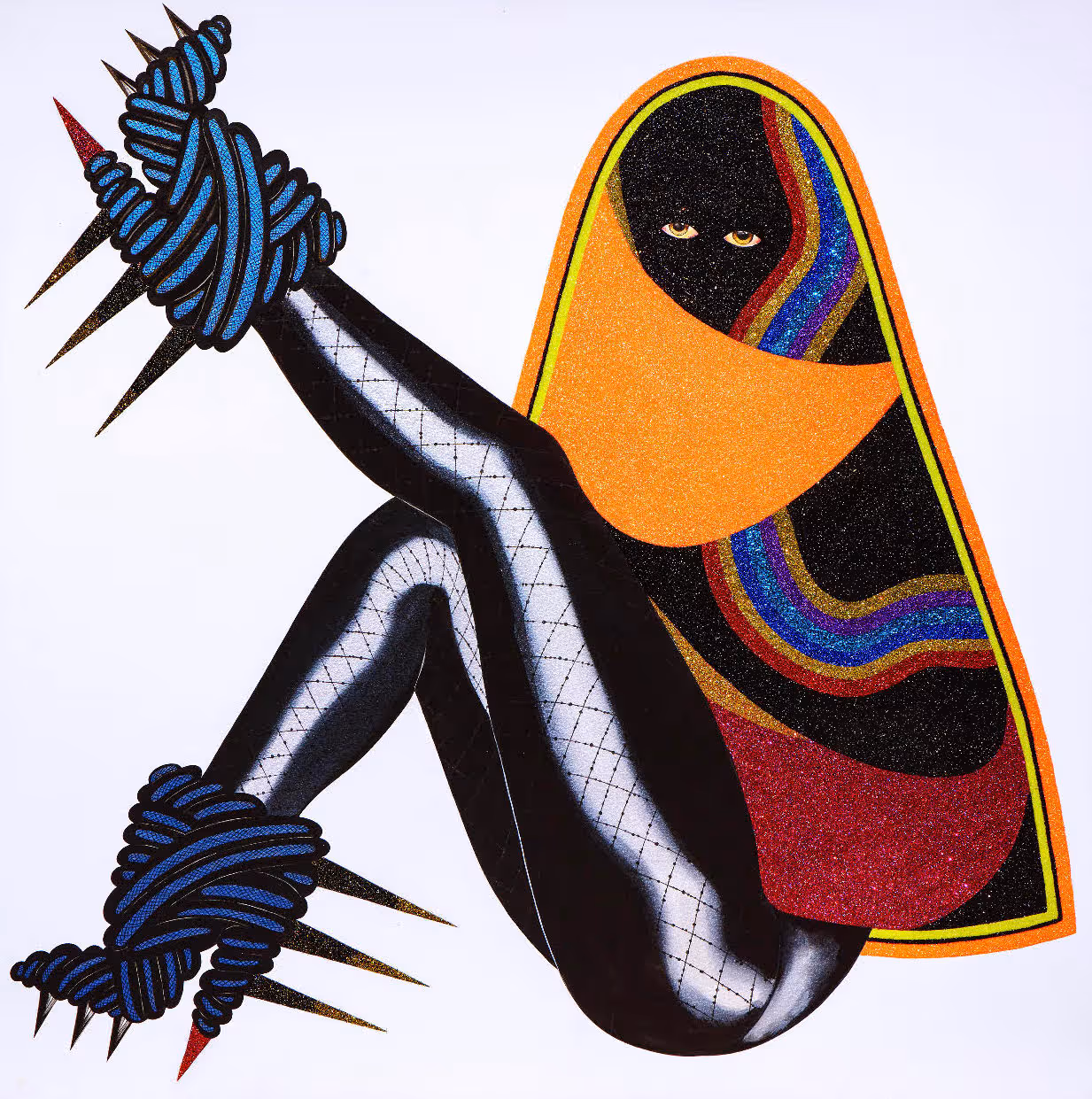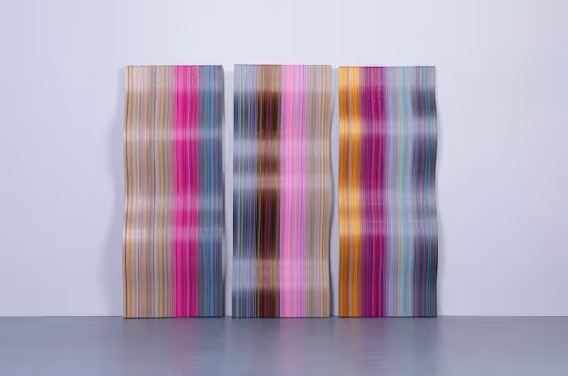 Where color floods the senses Nazzal points to natural phenomena that are all-encompassing. In a deeply layered artistic process, she meticulously chooses every component and shift in tone as a means of dissecting colors we see in nature and those we don’t. There’s a notion of plenitude in the way hues conjoin and shimmer. Her seemingly contained works incorporate a rich palette of PVC strings that teeter between solidity and fluidity. She has mastered materials, which, known for more pliable forms in friendship bracelets and keychains, are now sculptural flows that stream like thoughts.