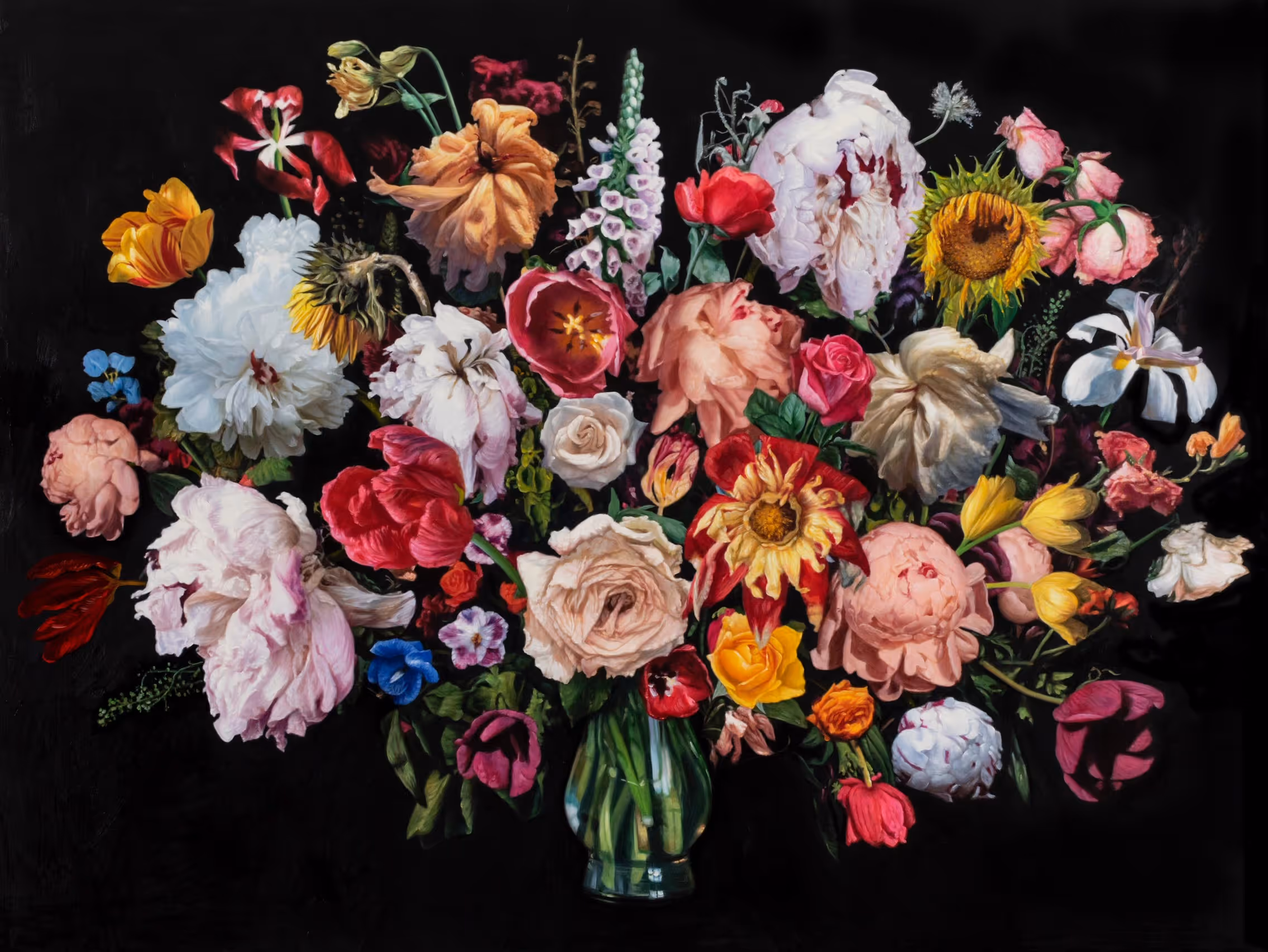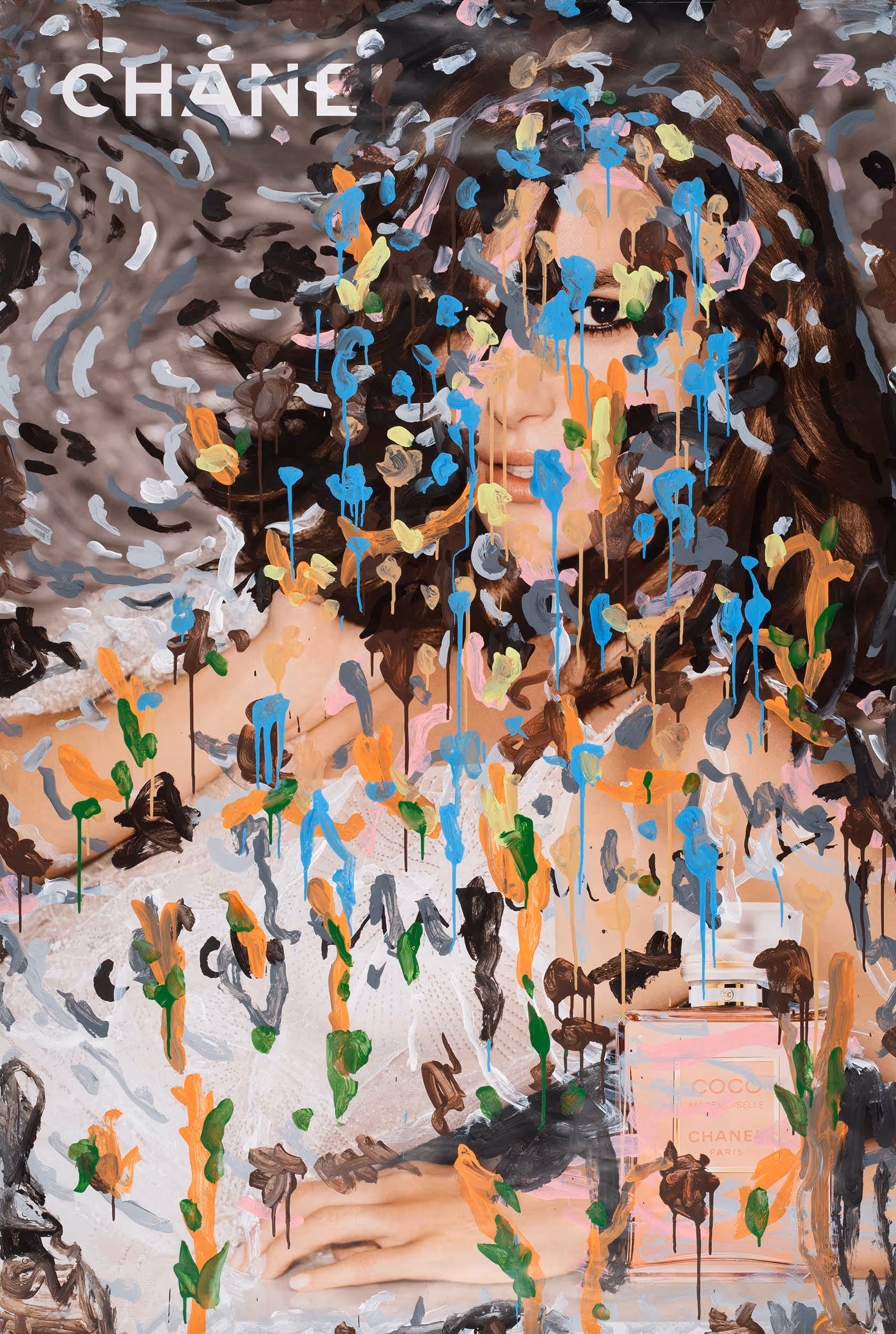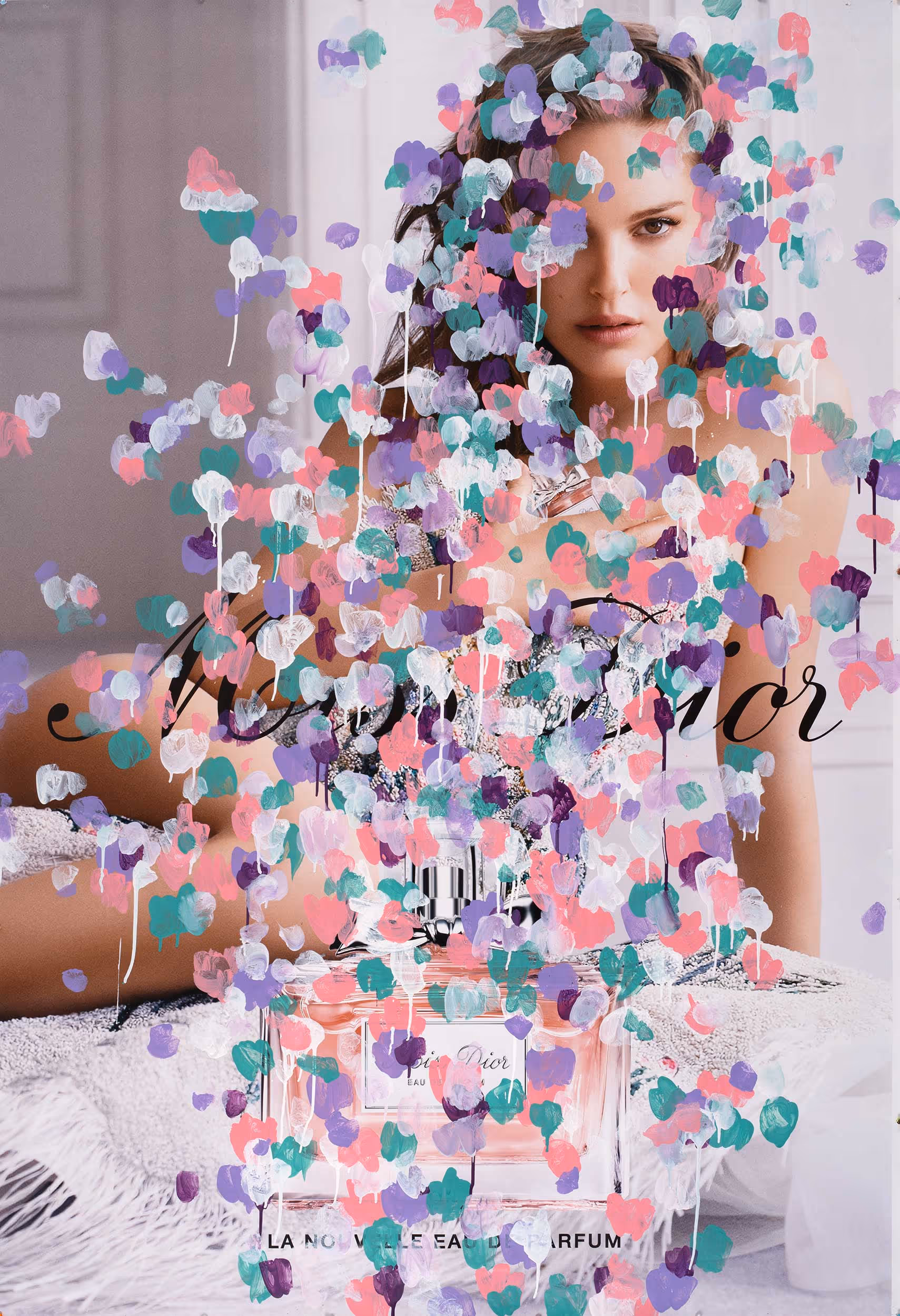 New York City based artist, Michael De Feo has been painting flowers around the world since the early 1990’s. Rooted at the forefront of the street art movement in New York, he earned the moniker “The Flower Guy”. Continuously exploring the alluring beauty of the natural world, Michael created a series of flower-inspired paintings symbolizing beauty, ephemerality, ritualistic expression, and the cycle of life. Beginning in 2015, he used a master key to access the ad spaces in city bus-stops, inserting his paintings in place of the original branded campaigns, combining the intimacy of these bouquets with an outdoor projection. As the removed advertisements piled up in his studio, he began painting over them, and then reinstalled them back into the vitrines on the streets. This body of work merges fashion takeovers with guerrilla art by both subverting and celebrating the underlying images. With the excitement that came out of combining the fashion world with floral treatments, an ongoing series of magazine page interventions came to life. This exhibition encompasses works from these different moments in his career, visualizing his trajectory. His studio work incorporates a wide range of influences, from Dutch 17th century still life painting to fashion magazines and fashion advertising campaigns. He often adds his floral treatments and cascades of multicolored petals to existing printed images from the fashion world and art history/traditional art, which both subverts and celebrates the underlying image. Michael was asked to paint his signature flowers on the Neiman Marcus covers. In an interesting connection to Dallas, Michael did a collaboration with the Neiman Marcus catalog “The Book” back in 2016. These covers were part of a series of NM catalogs that year that won a Clio Award.