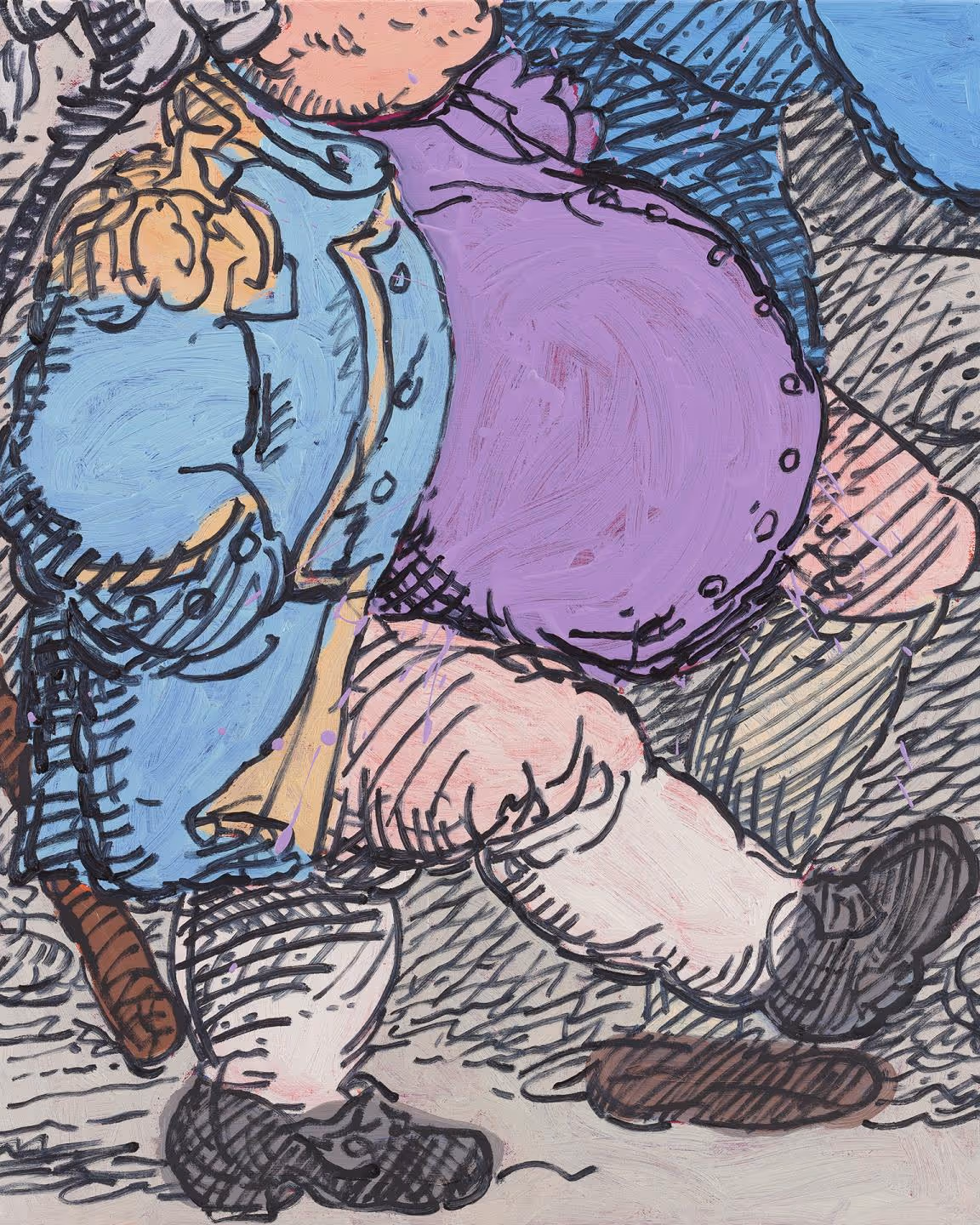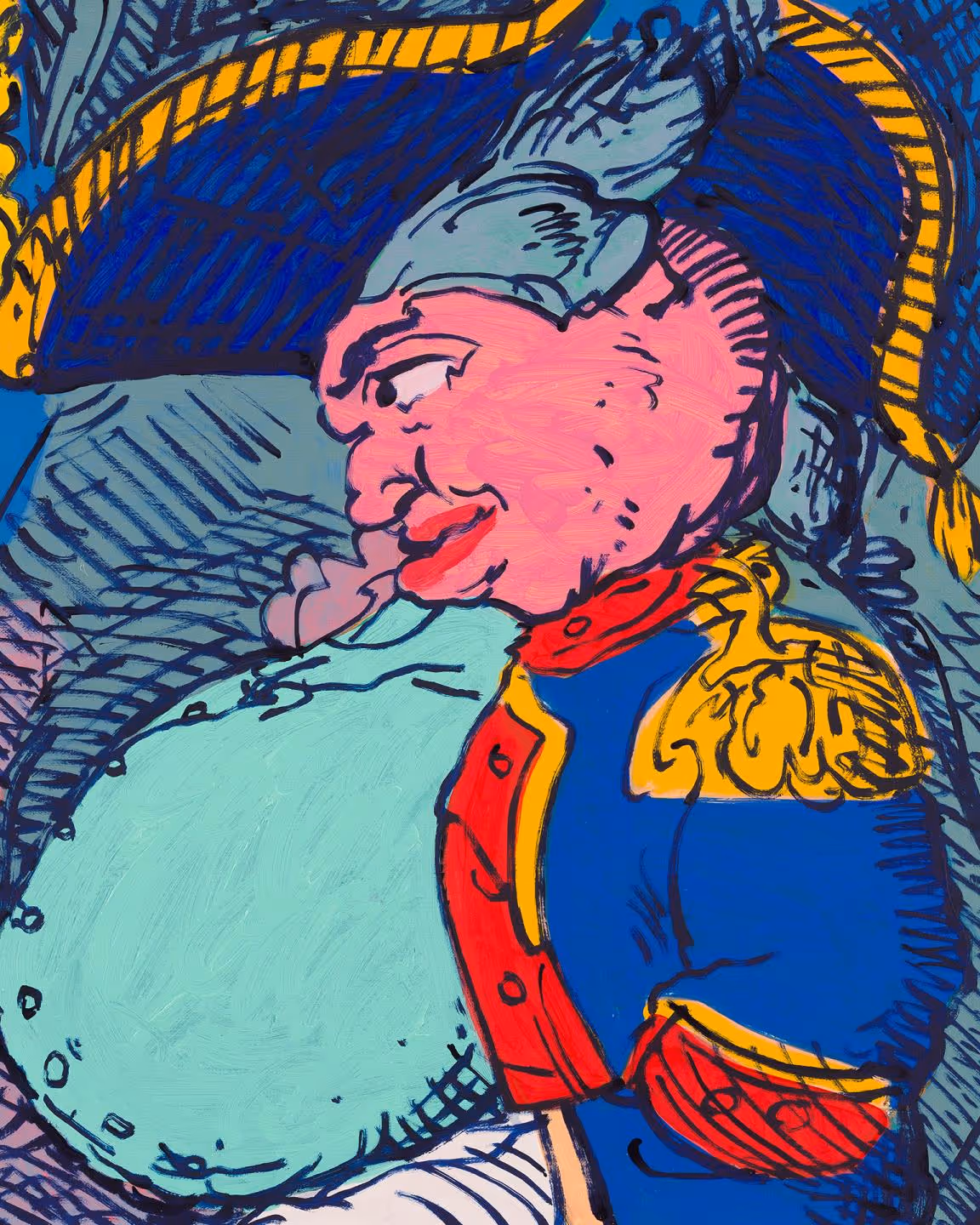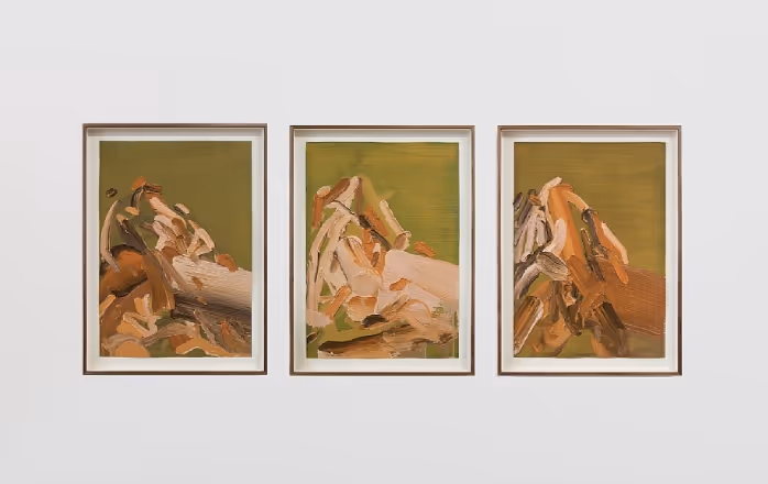 Charlie Billingham takes imagery from Regency-era satirical prints and drawings, cropping and distorting sections to create new compositions, devoid of the intended political and social meanings of the original illustrations. A rainbow of powdered wigs, plumed bonnets, sagging britches, and full-figured bottoms dance across his paintings. The canvases, which are sometimes hinged together to make folding screens, are often hung on block printed wall paintings and alongside colorful painted plant pots and houseplants, to create decorative, domestic interiors. Charlie Billingham (b. 1984, London) studied Fine Art and History of Art in Edinburgh (2008) and then Fine Art at the Royal Academy Schools in London (2013).