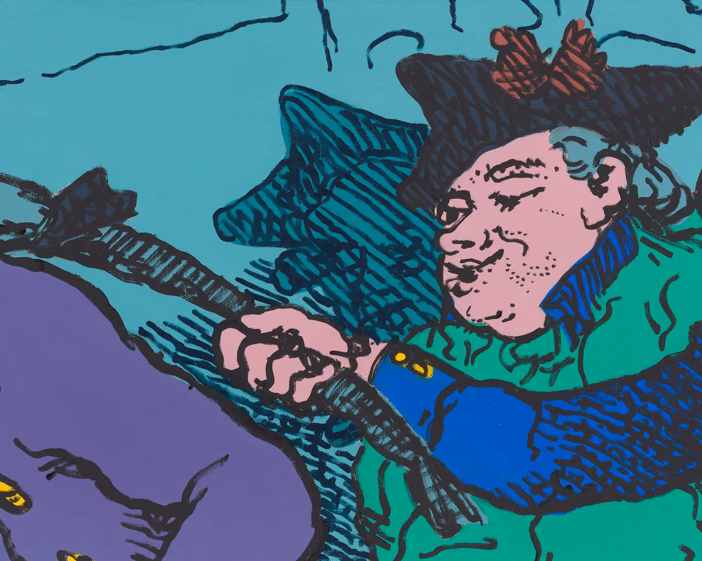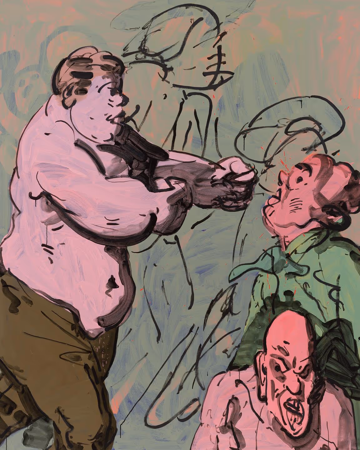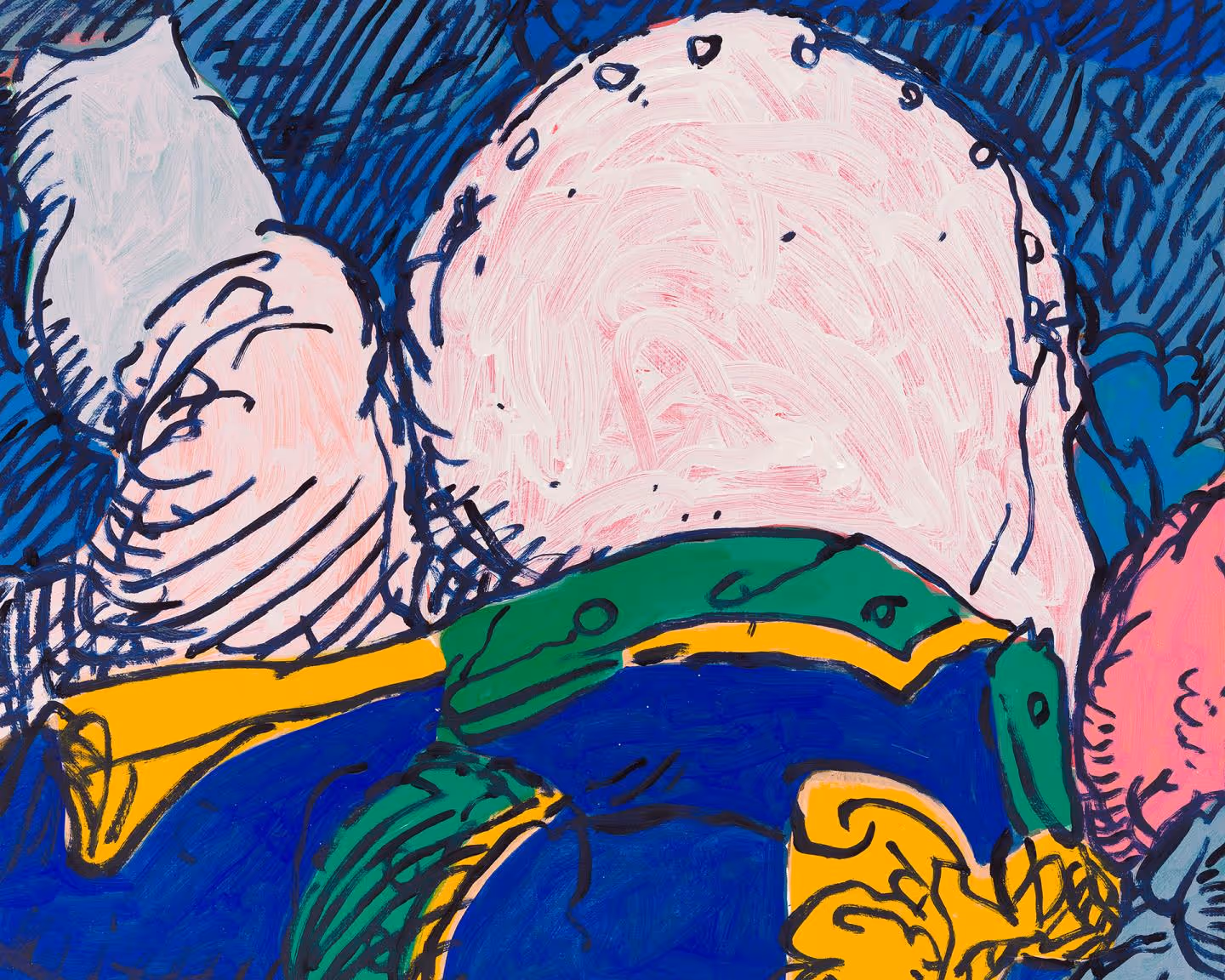 Charlie Billingham takes imagery from Regency-era satirical prints and drawings, cropping and distorting sections to create new compositions, devoid of the intended political and social meanings of the original illustrations. A rainbow of powdered wigs, plumed bonnets, sagging britches, and full-figured bottoms dance across his paintings. The canvases, which are sometimes hinged together to make folding screens, are often hung on block printed wall paintings and alongside colorful painted plant pots and houseplants, to create decorative, domestic interiors. Charlie Billingham (b. 1984, London) studied Fine Art and History of Art in Edinburgh (2008) and then Fine Art at the Royal Academy Schools in London (2013).