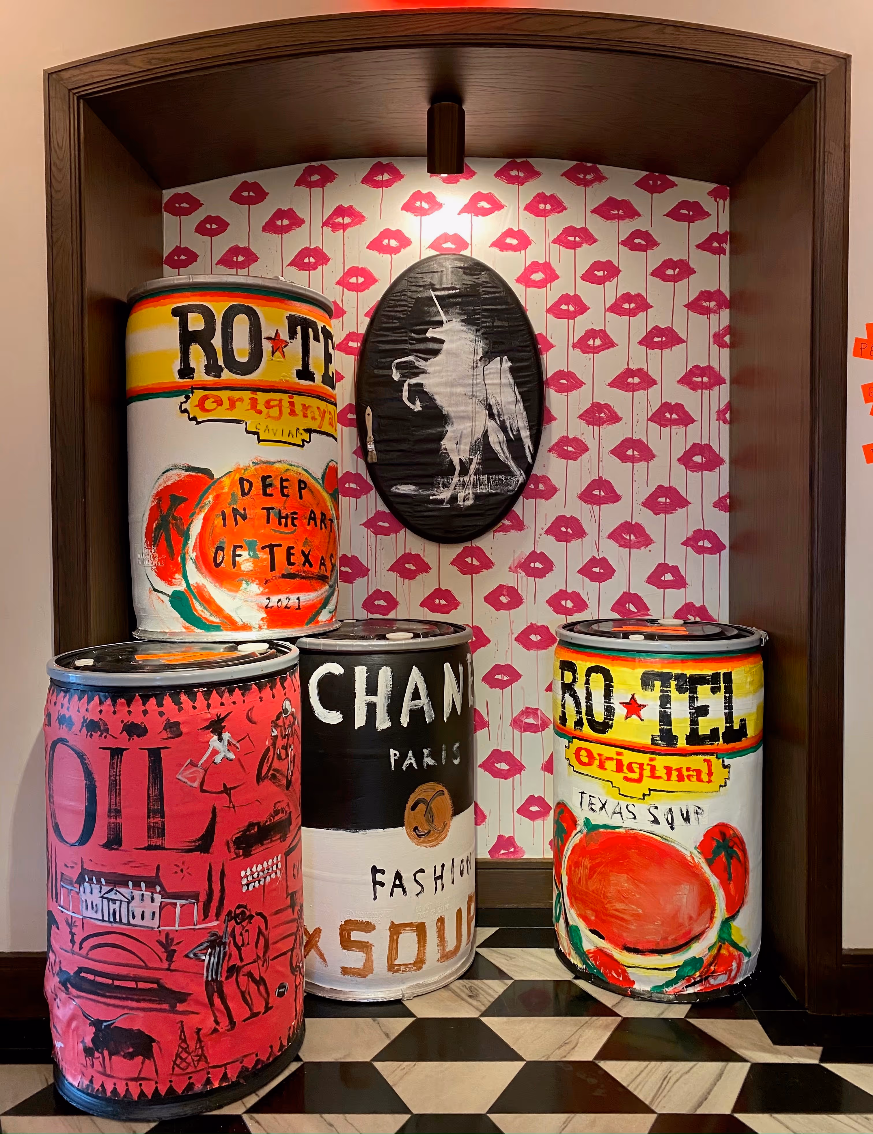 “Happy April Fools!” The perfect day to open a show of my work. I pride myself on being foolish. I love making ridiculous things. “Funny Art” - not just because people who know better told me not to. Oh no. I explained it this way...I like my work to be “tongue in chic”. That explains what I do perfectly. Stupid I know. Google if you will my first solo show I did in Paris at Colette. It was during French Fashion week. I had been invited by Madam Colette herself to show my Portraits I make out of Walnuts. The show was called #fashionisnuts! It was so stupid and so genius at the same time. I’ll never forget Planters peanuts executives tried to contact me after because they said it’s hard to get high end fashion press for nuts! I proved them wrong.People in California said I was crazy for moving to Texas. That was in December 2020. I got here in January 2021 and my wife, Kim, and I immediately landed on a bar sofa in Park House. We had the best night. Deborah asked me to lunch the next day. She had me sign one of the last copies of my (sold out) book. Then, we came up with the idea to let me art bomb the joint. The front part!!! I am thrilled to have the blank walls to share all my latest work. Inspired by my very long drive to Texas. I drove a dog and my middle son, Ted. Kim and the other two flew. It was a great trip and sparked something in me very deeply. Now the broker that sold me our house in Highland Park says all his appointments these days are showing people from California houses for sale. Ha! Who is the genius now!!! I’m sorry my Assouline coffee table book sold out. I would love to have it at Park House. I got a coffee table book of all my work because I was painting my name on their other covers and they asked me to stop. So, I got my own book. See how smart it is to do dumb things. Did I mention it sold out? Texas is a world into itself. Diana Vreeland said 'the eye has to travel.' She was right. I have a lobby stuffed with inspired art to prove it."