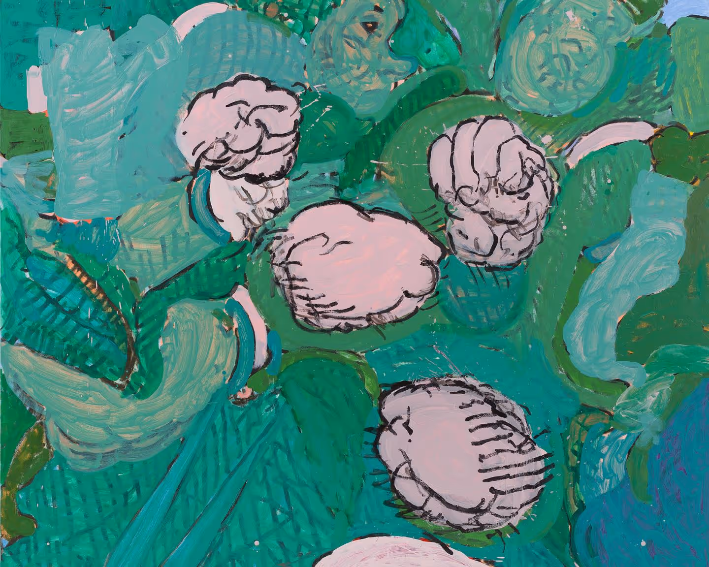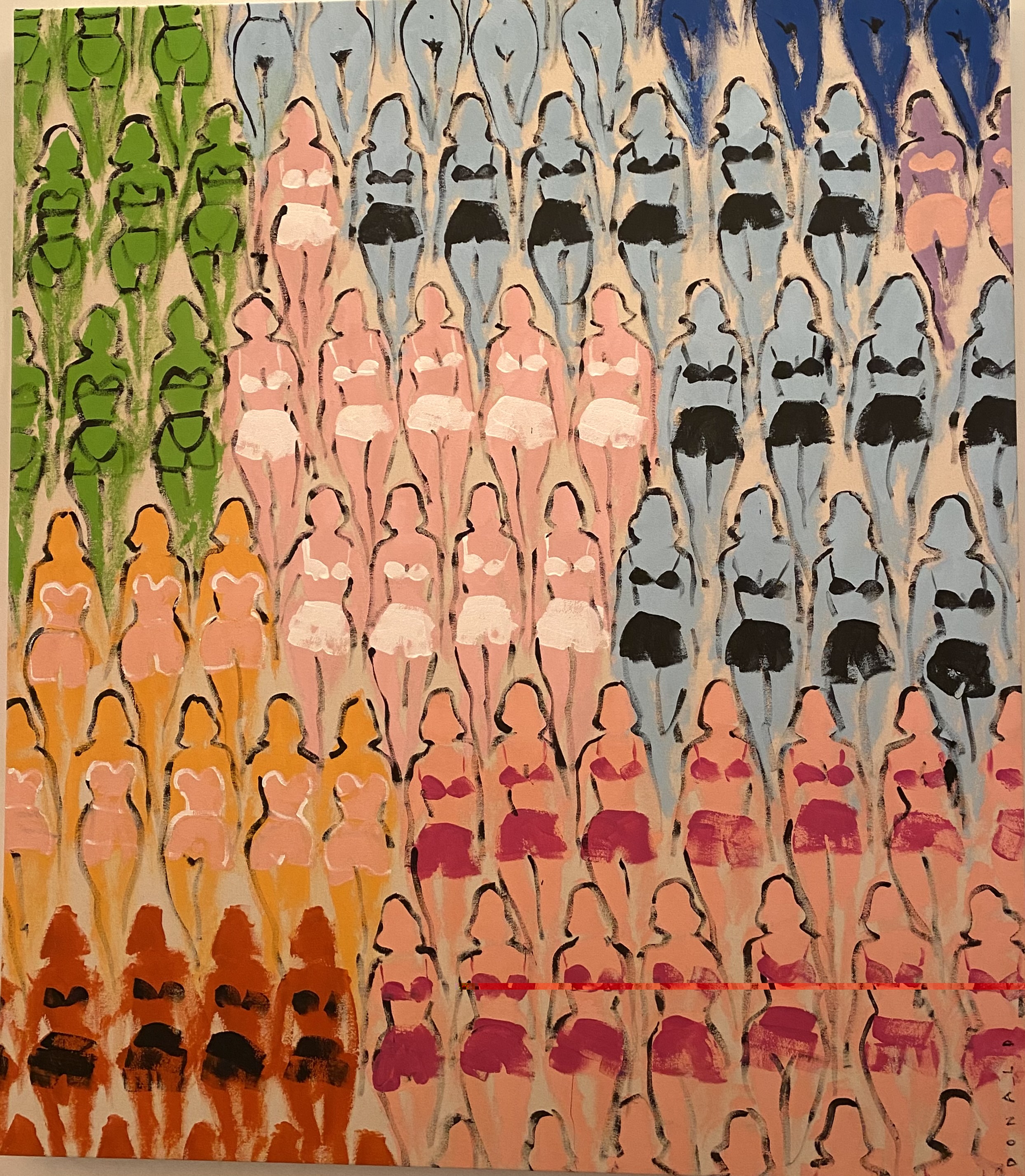 From the collection of Erin Cluley and Tearlach Hutcheson and the Park House Collection, Katherine Bradford from the collection of Lisa and John Runyon, Sara Cardona from the collection of Carolina Alvarez-Mathies, Michelle Grabner from the collection of Mark Giambrone, Marilyn Minter from the collection of Deborah and John Scott, and Lorna Simpson from the collection of Nancy C. Rogers.